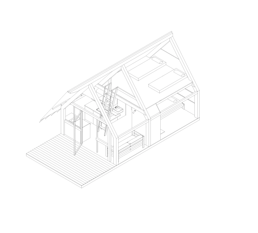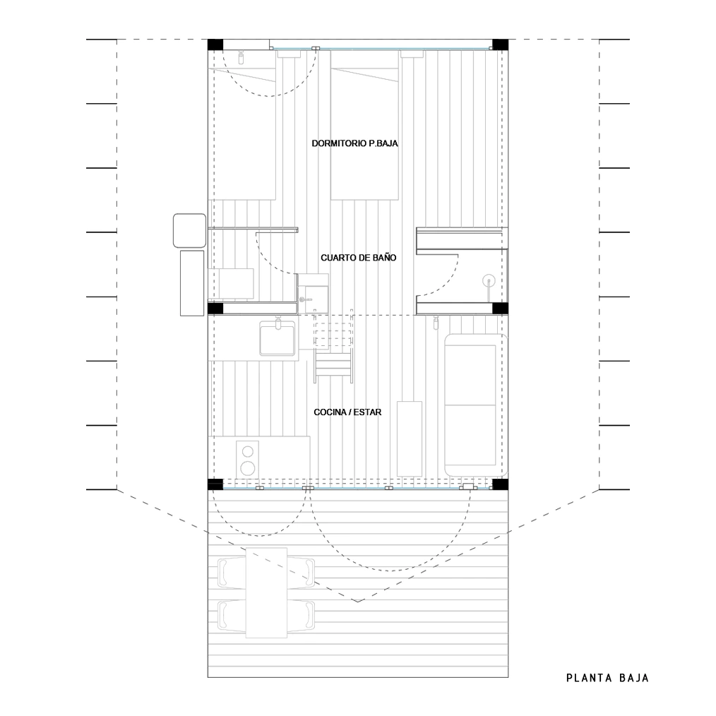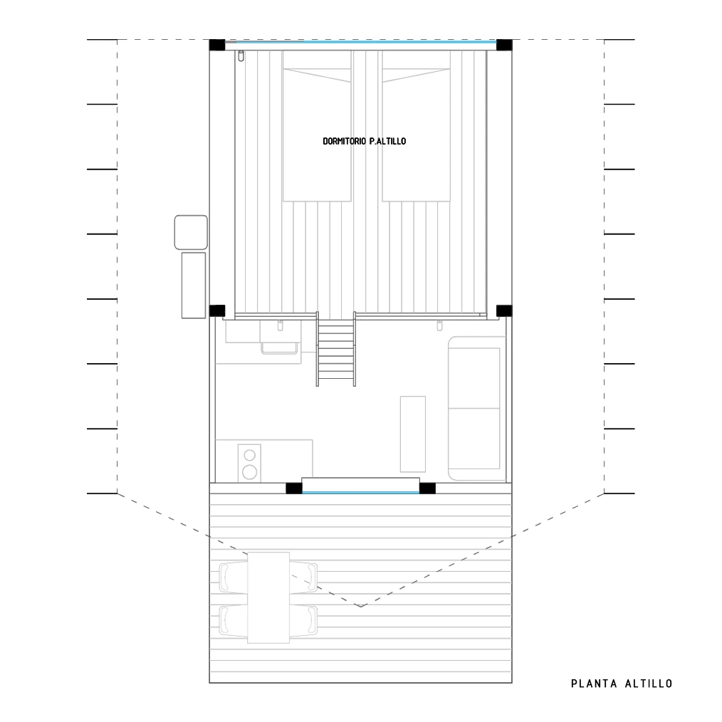 • Dimensiones:  · 4 x 8, 5 m totales · 4 x 6 m interiores en planta baja, 3,30 x 3,65 m en planta altillo y 4 x 2,5 m de terraza